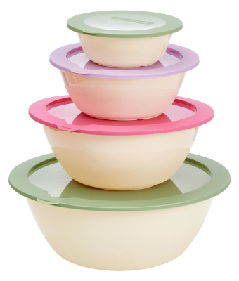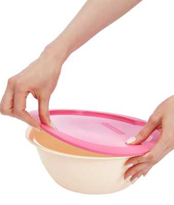Thanks to the flat lid, the salad bowls can be conveniently stacked on top of each other for storage and transport. The wide upper rim makes it easy to hold the bowl while whisking or mixing food. A small tab on the lid ensures easy opening.